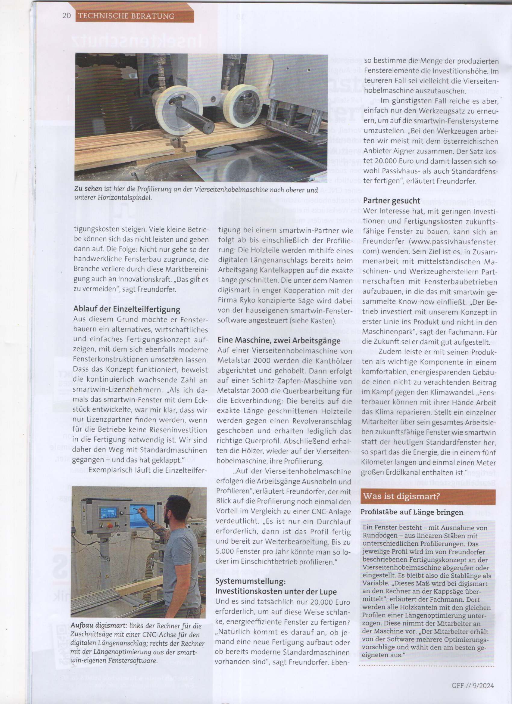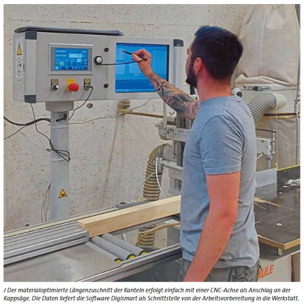 Ein CNC gesteuerter Längenanschlag für den längenoptinmierten Zuschnitt der Holz- und Aluminiumteile bildet die Basis. Die aufwändige Fixierung der Schließteile bei den Blendrahmenprofilen geschieht am losen Teil. Die hauseigene Software digismart fährt die Blendrahmenteil ab und kennt alle Beschlagsteile samt Position.